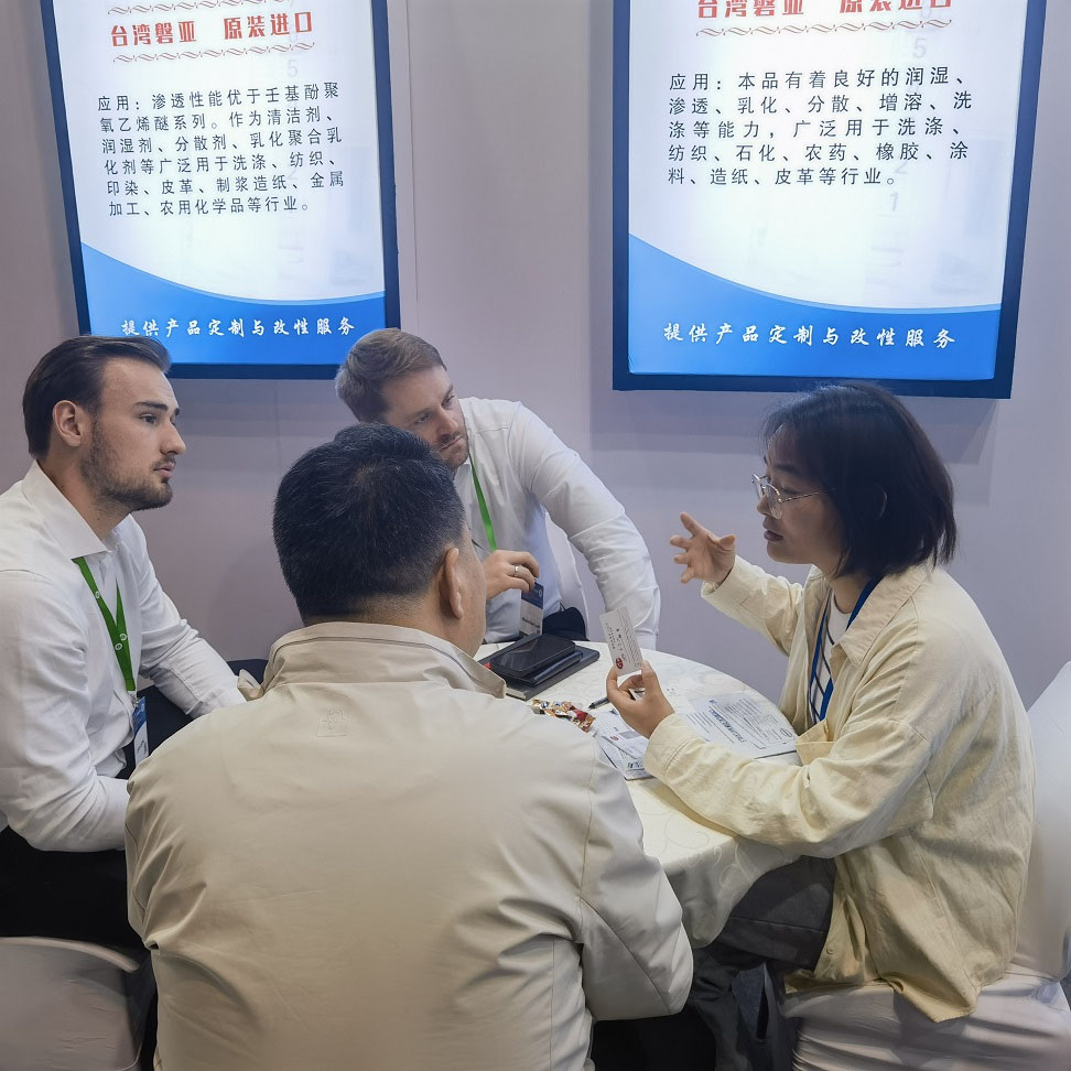 During the exhibition, we welcomed numerous new and existing friends to jointly discuss the effective applications of surfactant products in detergents. For industrial detergents, we mainly recommended the industrial applications of products such as Nonylphenol Polyoxyethylene Ether (NPE Series), Fatty Alcohol Polyoxyethylene Ether (AEO Series), and Nonylphenol (NP); for household detergents, we focused on the effective applications of Sodium Lauryl Ether Sulfate (SLES) and Linear Alkylbenzene Sulfonic Acid Sodium Salt (LABSA) in laundry powder and liquid detergents.